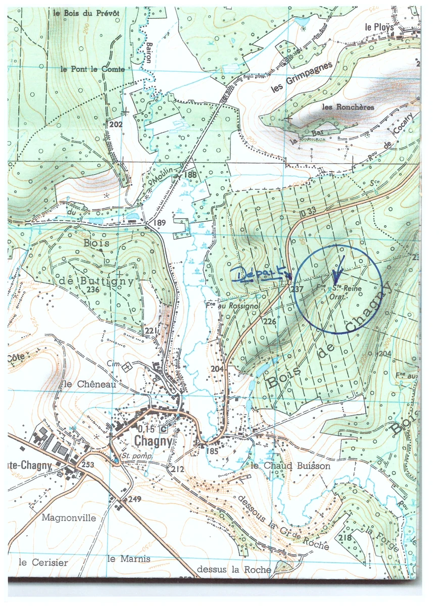 Localisation: Quitter Charleville-Mézières par l’A34. Prendre la sortie 13 (Poix- Terron) et suivre la D991 en direction de Le Chesne. Après Bouvellemont,, prendre à gauche la D33 qui conduit à Chagny et Omont. Traverser le village de Chagny et suivre la D33 sur 1km300 environ en direction de Omont. Petit parking sur la droite, à proximité du départ du circuit (Balise « Oratoire Sainte Reine » et calvaire en pierre). A ce jour, seul le point de départ est balisé par un panneau. L’oratoire et la fontaine Sainte Reine ne sont pas très loin (environ 500m.) mais terrain accidenté et sauvage avec points de repère difficiles… Carte et boussole sont les bienvenues !!…. Merci à Hervé Peth pour son aide !….