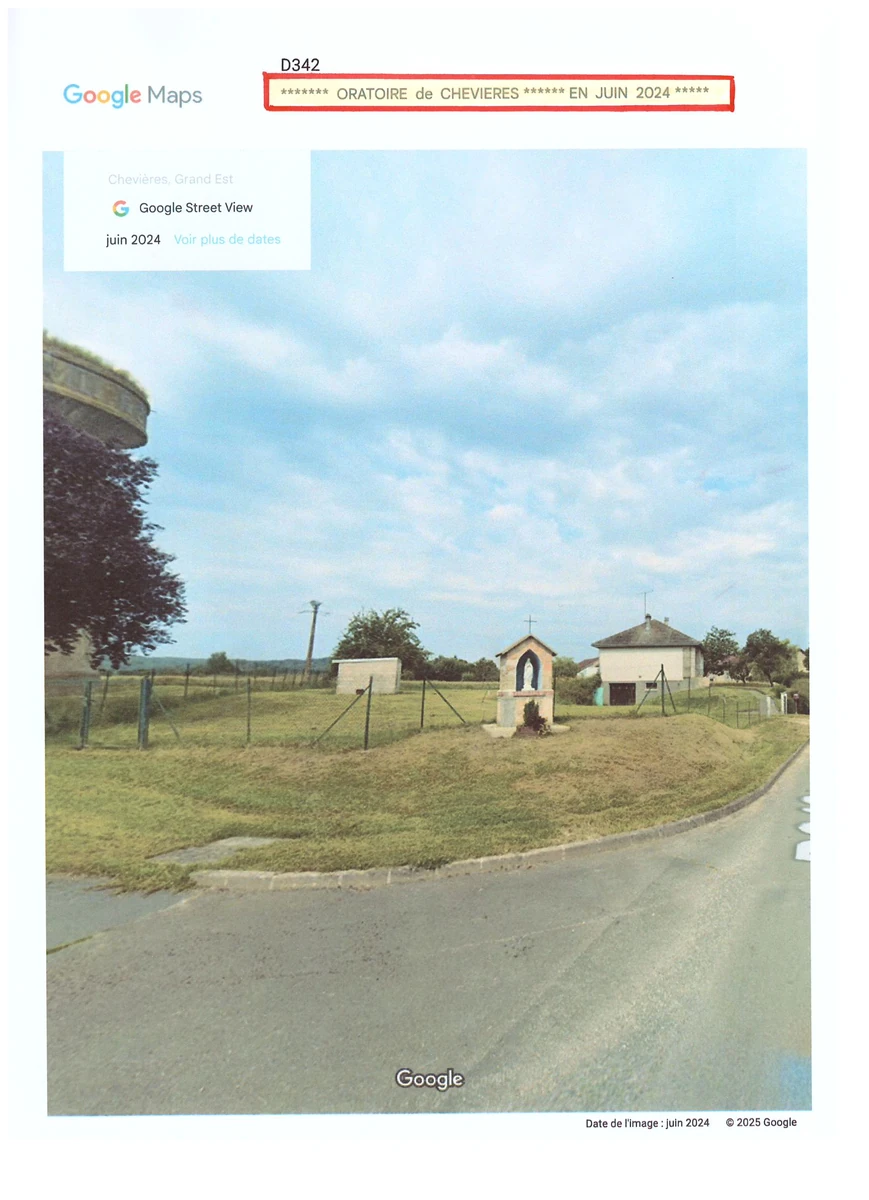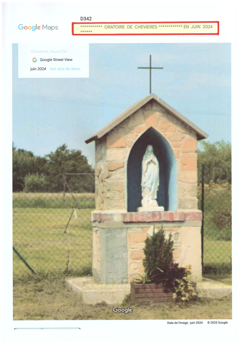 Localisation : Quitter Charleville6Mézières par l’A34. Sortie 13 (Poix- Terron). Prendre la D991 en direction du Chesne. Là, prendre la D977 en direction de Vouziers. Là, prendre sur la gauche la D946 puis sur la droite la D946 en direction de Grandpré. Dans cette ville, prendre la D342 en direction de Chevières que l’on traverse ( Rue principale). L’oratoire est bien visible à droite, près du cimetière et d’un château d’eau.