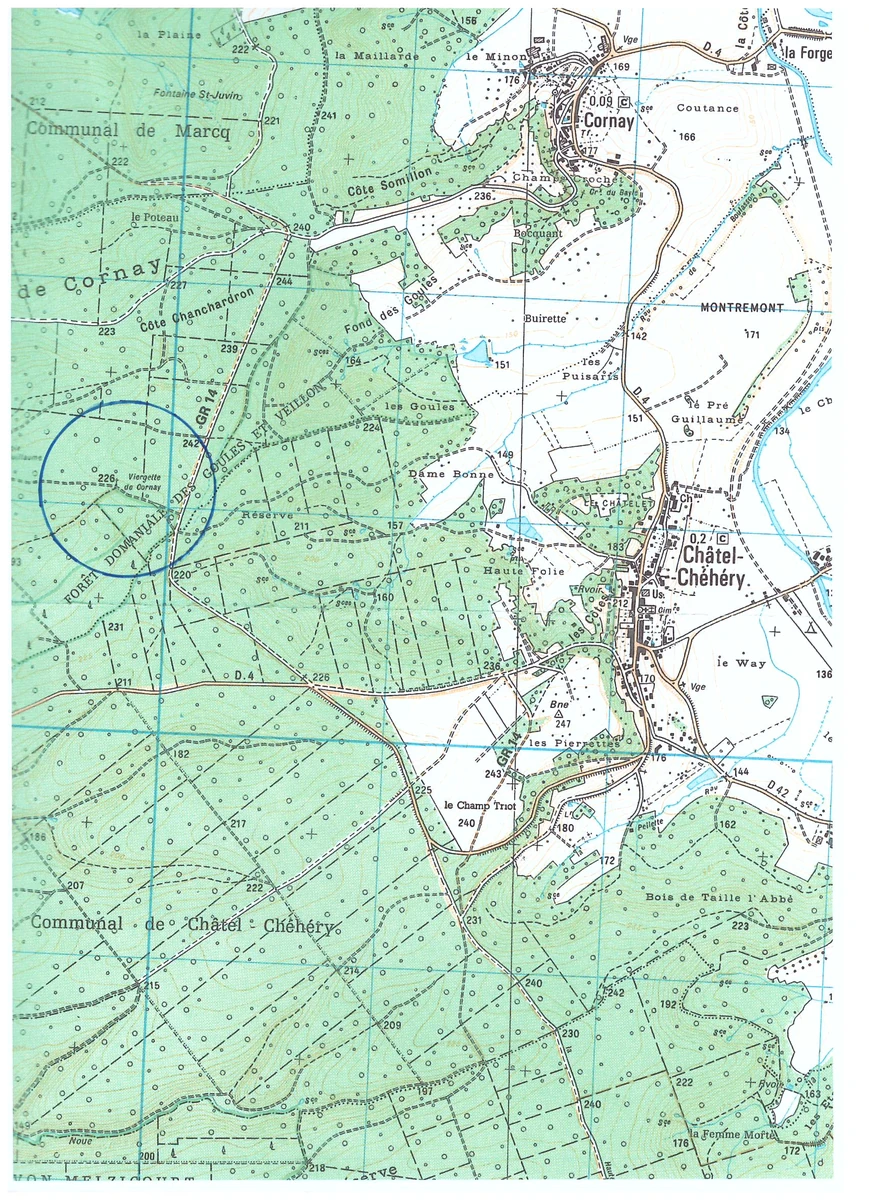 Localisation : Se rendre à Vouziers *** De là, suivre la D946 en direction de Grandpré puis en direction de Varennes-en-Argonne. A Fléville, prendre à droite la D4 vers Cornay puis Chatel-Chéhéry, que l’on traverse. Continuer ensuite la D4 en direction de Lançon et Autry. Le GR 14 traverse la D4 (Se garer au bord de la route). Le suivre sur la droite sur 1km environ. On s’enfonce en pleine forêt domaniale des Goules et Veillon. Prendre alors à gauche un chemin (Panneau ‘’ Viergette de Cornay’’) sur moins de 500m. La Viergette est sur la droite, signalée là encore par un panneau. Végétation dense ++.