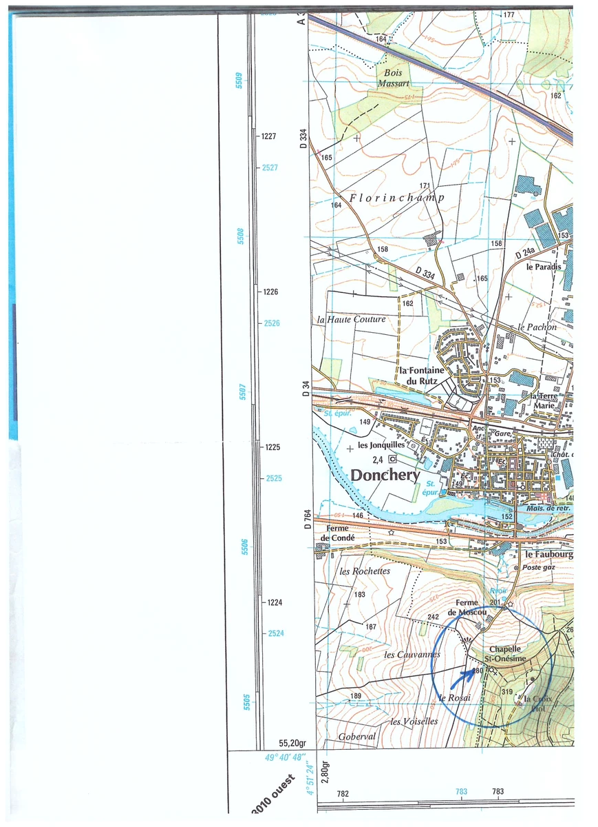 Localisation : Quitter Charleville-Mézières par la ‘’Rocade’’. Prendre la sortie 8 (Villers Semeuse-Centre commercial). Continuer par la D764 vers Flize, Dom le Mesnil. De là, continuer sur 5 Km environ pour arriver à Donchery. Localement, la départementale s’appelle Rue de l’Entrevue. Tourner à droite et suivre la rue de Moscou (Panneau Circuit de la Croix Piot). Suivre le balisage. La chapelle est en pleine forêt.